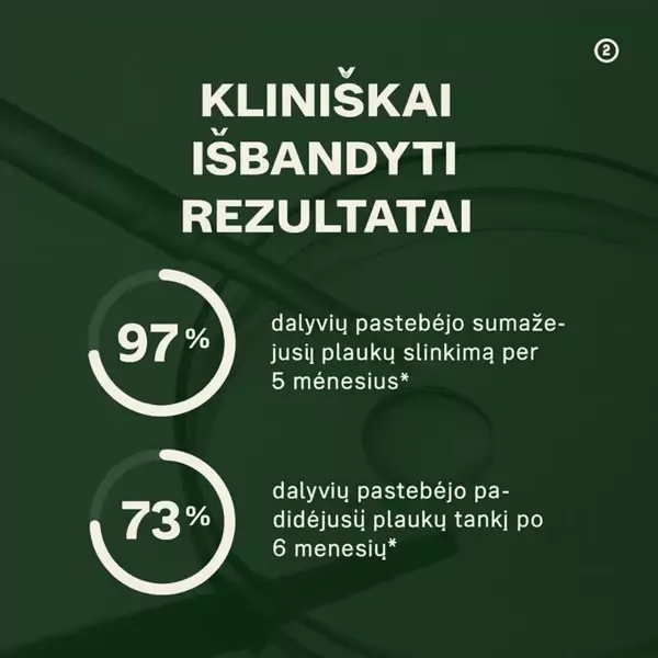 Rezultatai gali skirtis priklausomai nuo individualių savybių. Baicapil® klinikinio tyrimo dalyviams jau po 90 dienų plaukų slinkimas sumažėjo net 60 %, o po 180 dienų plaukų tankumas padidėjo net 18%.