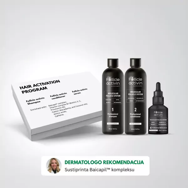 Follicle Activin losjonas (60 ml): Aqua, Caffeine anhydrous, Benzyl alcohol, Sodium benzoate, D-panthenol, Glycerin, Hydrolyzed Soy Protein, Hydrolyzed wheat Protein, Potassium Sorbate, ascorbic acid, Tocopherol acetate, Scutellaria baicalensis root extract, Biotin, Propanediol, Lactic acid, Arginine, Glycine Soja Germ Extract, Triticum Vulgare Germ Extract, Gluconolactone, Calcium Gluconate.
