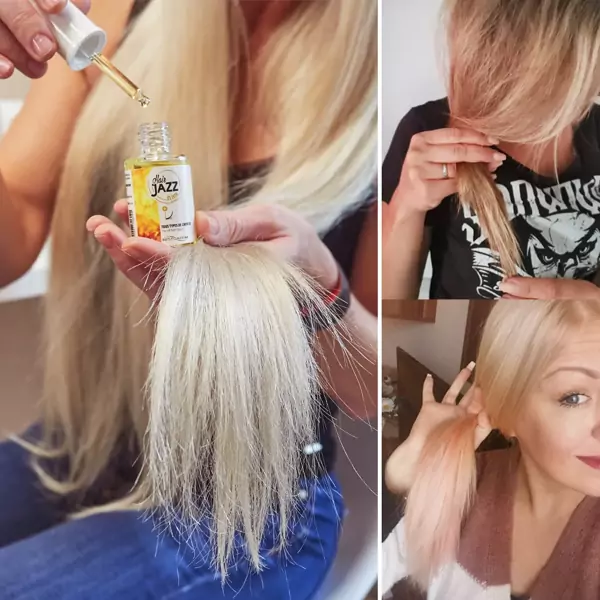 - IŠDŽIOVINUS PLAUKUS. Procedūrai užbaigti HAIR JAZZ serumą naudokite kaip lengvą plaukų puoselėjimo priemonę. Paskirstykite ją per visą plaukų ilgį iki pat galiukų.