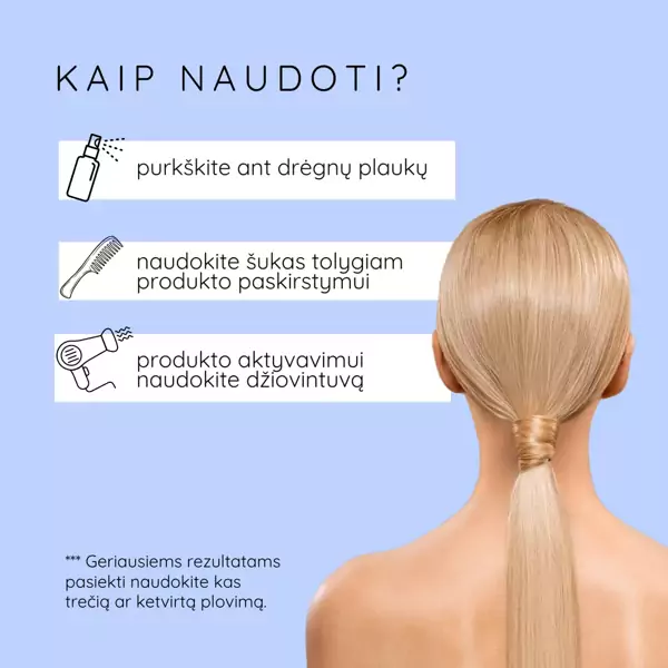 - Reikia džiovinti plaukus naudojant feną ar kaitinimo žnyples, kad produktas suaktyvėtų. Produktui aktyvinti yra būtina šiluma.