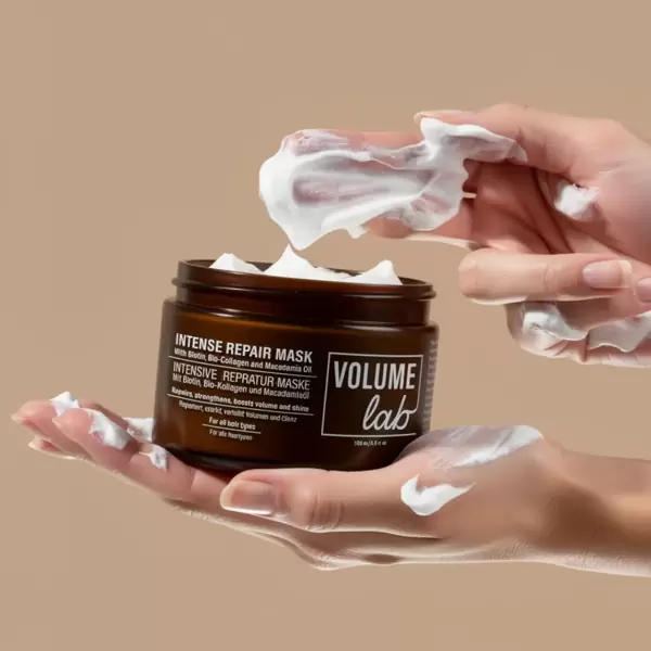 VOLUME LAB kaukė (100 ml): Kruopščiai išplaukite plaukus šampūnu, gerai išskalaukite. Aplikuokite plaukus glotninančią priemonę, gerai išskalaukite.