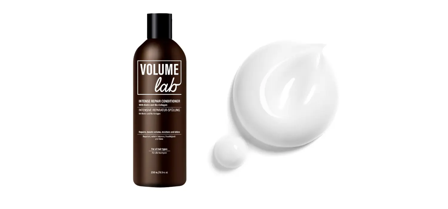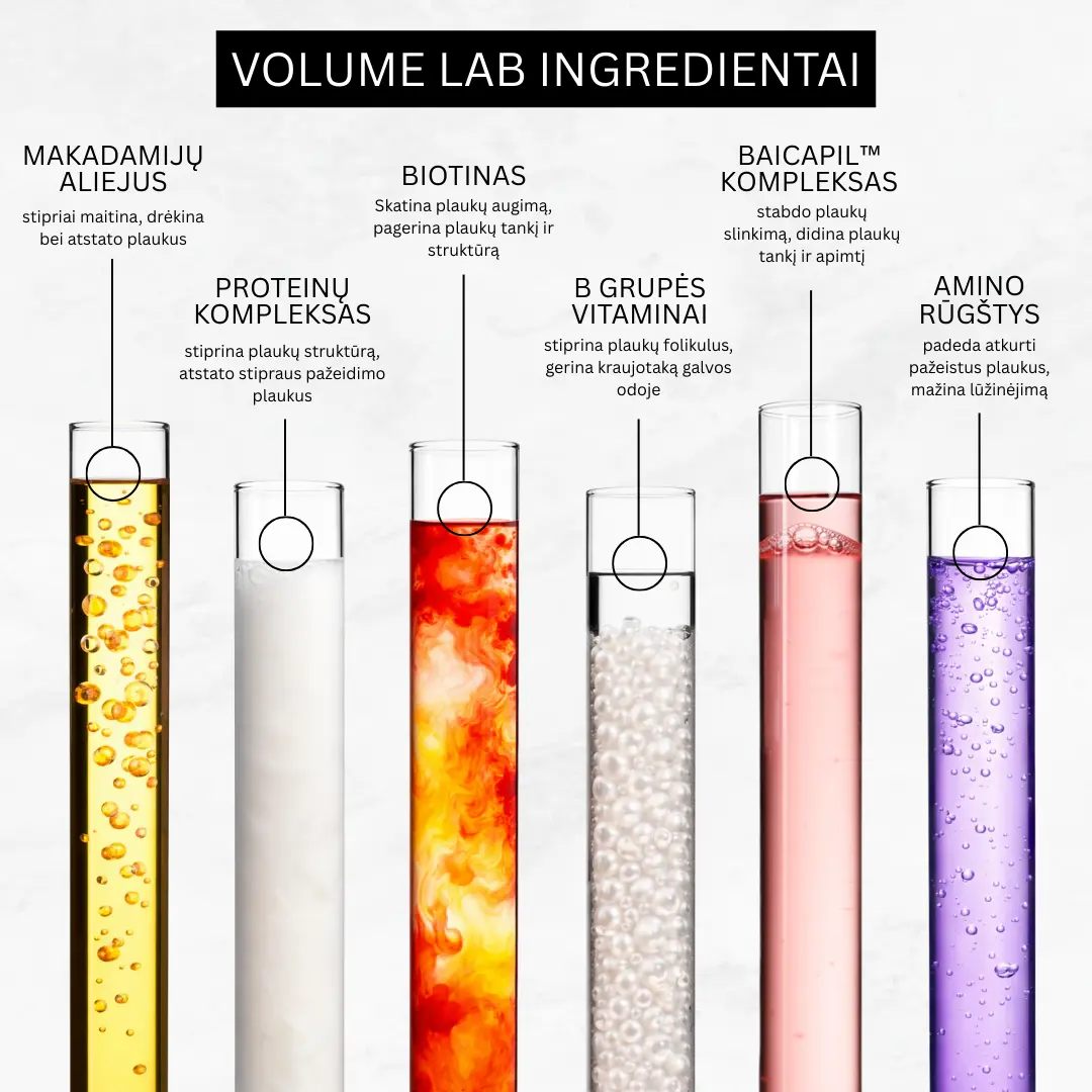 VOLUME LAB Kondicionierius (250 ml): Aqua, Cetearyl Alcohol, Behenamidopropyl Dimethylamine, Macadamia Ternifolia Seed Oil, Lactic Acid, Benzyl Alcohol, Hydrolyzed Wheat Protein, D-panthenol, Sodium Benzoate, Glycolic Acid, Quaternium-80, Potassium Sorbate, Peg-7 Glyceryl- Cocoate, Laurel Glucoside, Fragrance, Caprylyl/capryl Glucoside, Biotin, Propylene Glycol, Phenoxyethanol.