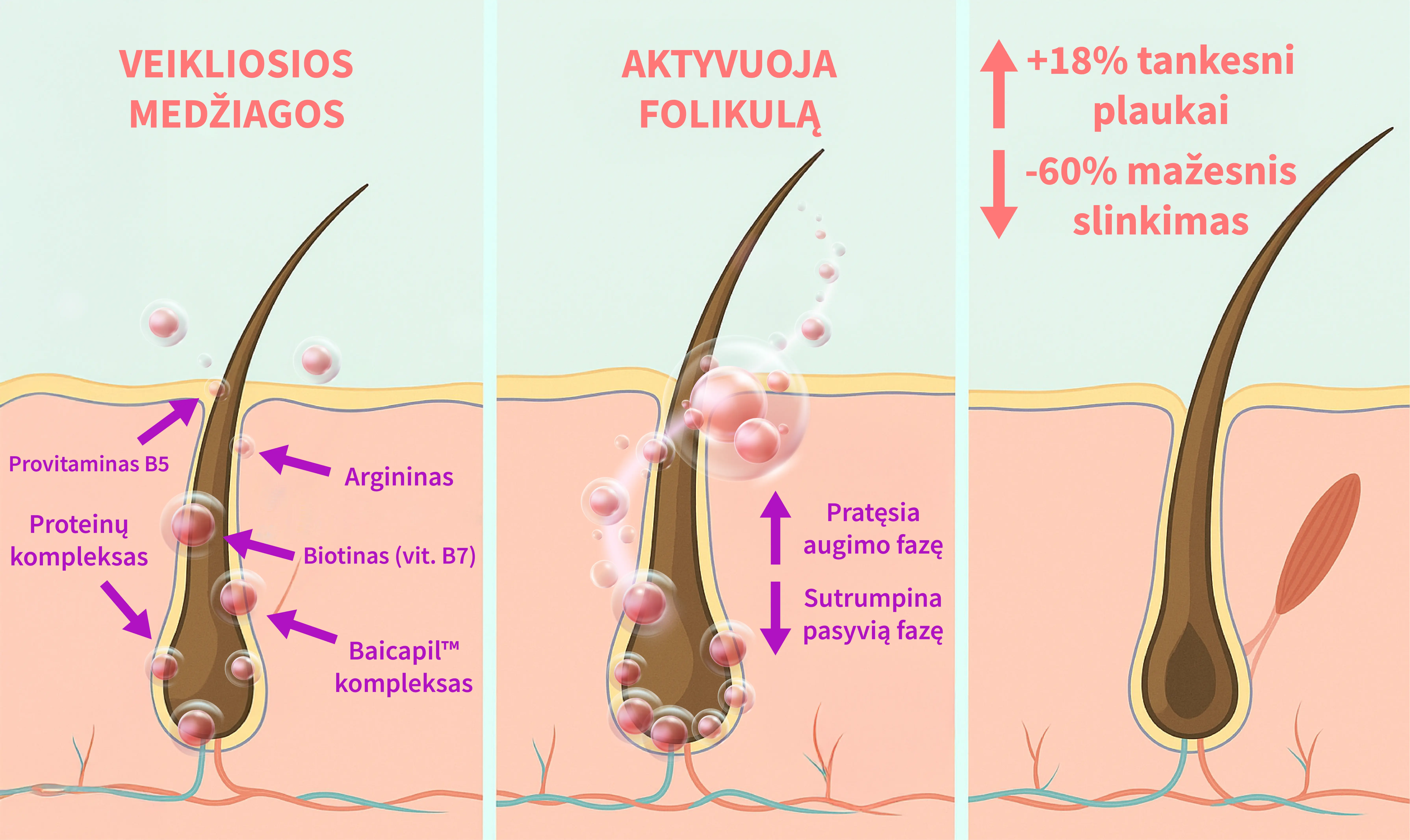 Skatina plaukų augimą, stimuliuoja folikulų veiklą, atkuria plaukų struktūrą.